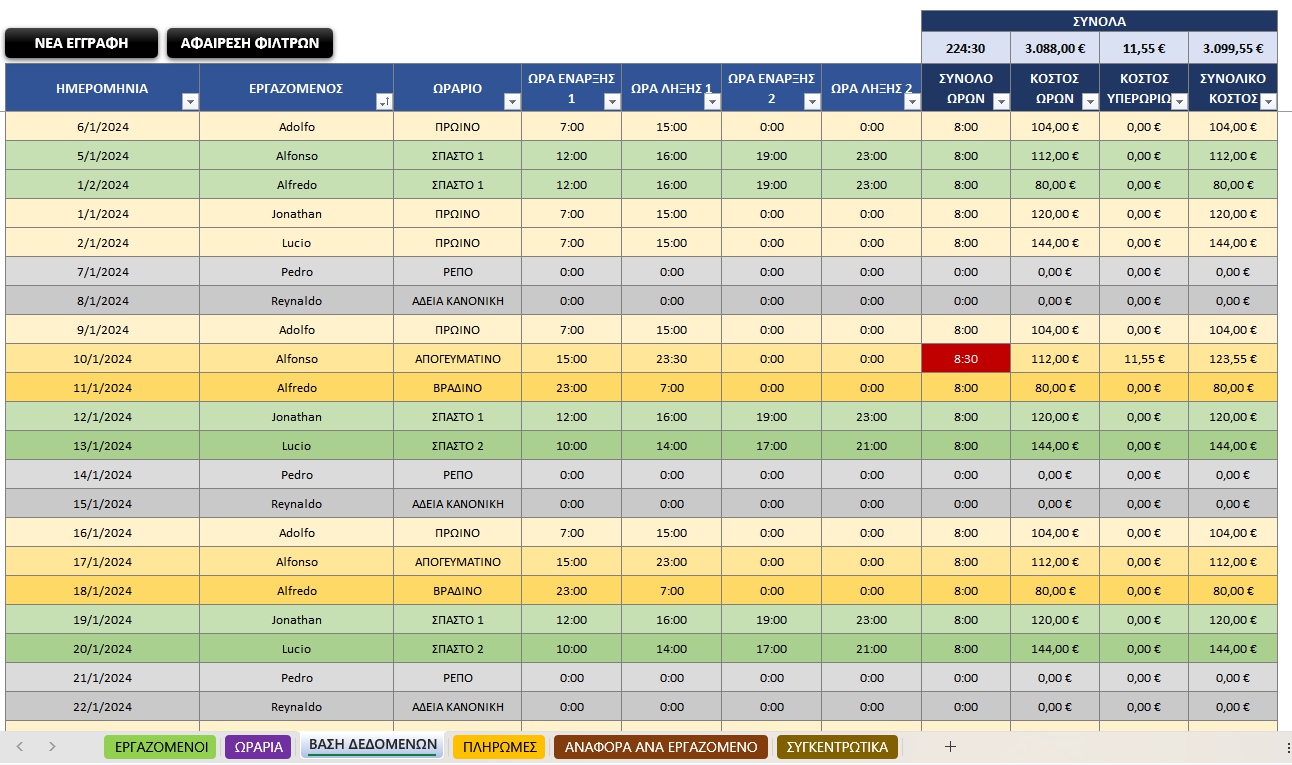 Υπολογισμοί και Στατιστικά: Σχεδόν σε κάθε οθόνη της εφαρμογής βλέπετε χρήσιμα στατιστικά σχετικά με τις συνολικές ώρες εργασίας, τις αμοιβές, τις υπερωρίες και άλλα στοιχεία. Τα πεδία που περιέχουν συναρτήσεις για τους αυτόματους υπολογισμούς είναι προστατευμένα.